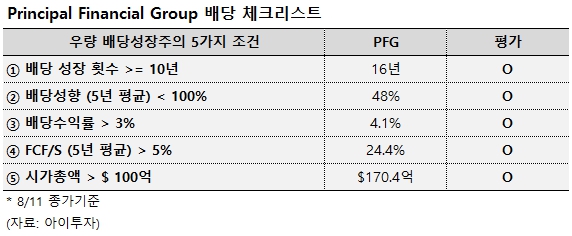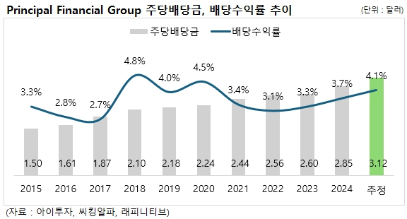 프린서플 파이낸셜 그룹은 16년 연속으로 배당금을 늘려온 배당성취주로, 11일 종가 기준 기대 배당수익률은 4.1%입니다(기대 연간 주당배당금 3.12달러). 배당락일은 9월 4일, 배당 지급일은 9월 26일로 예정되어 있습니다. 최근 5년간 주당 배당금은 연평균 5.5%씩 증가했습니다.