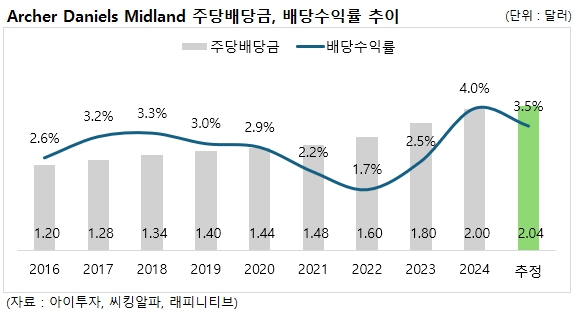 아처 대니얼스 미들랜드는 23년 연속 주당 배당금을 인상해온 배당성취주로, 11일 종가 기준 기대 배당수익률은 3.5%(기대 연간 주당 배당금 2.04달러)입니다. 최근 5년간 주당 배당금은 연평균 7.4%씩 증가했으며, 배당락일은 8월 20일, 배당 지급일은 9월 10일로 예정되어 있습니다.