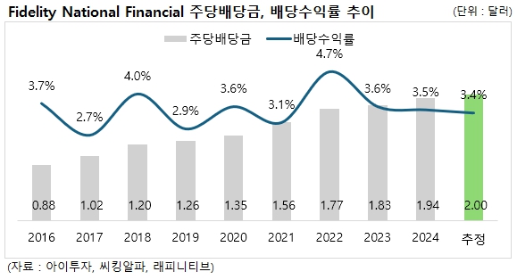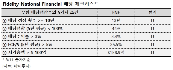 피델리티 내셔널 파이낸셜은 13년 연속 배당금을 인상한 배당성취주 입니다. 11일 종가 기준 기대 배당수익률은 3.4%(기대 연간 주당배당금 2달러)로 최근 5년간 주당배당금을 연평균 9% 인상했습니다. 배당락은 9월 16일, 배당 지급일은 9월 30일입니다.