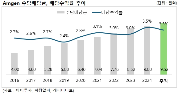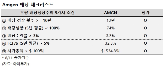 암젠은 13년 연속 배당금을 인상한 배당성취주로 11일 종가기준 기대 배당수익률은 3.3%, 최근 5년 연평균 주당배당금 인상률은 9.1%입니다. 배당락은 오는 22일, 배당지급일은 9월 12일로 예정되어 있습니다.