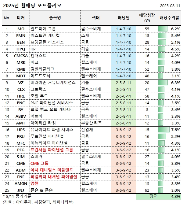 아이투자(itooza.com)에서는 매월 초 배당락 일정을 반영해, 다음 달부터 배당을 받을 수 있는 미국의 대표 배당주를 소개하고 있습니다. 이렇게 매월 선정된 종목들을 꾸준히 모으면 자연스럽게 우량한 월배당 포트폴리오를 구축할 수 있습니다.