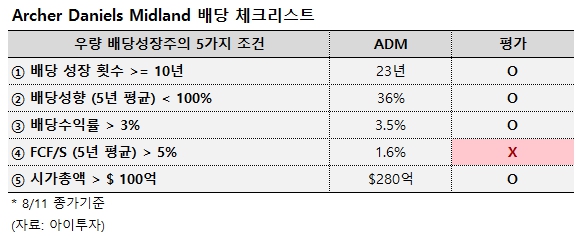 아처 대니얼스 미들랜드는 5년 평균 매출 대비 잉여현금흐름(FCF/S)이 1.6%에 불과해 우량 배당성장주 4번째 요건을 충족하지 못했습니다. 다만 이는 매출액 규모가 상대적으로 큰 저마진 사업 구조(영업이익률 2~4%)에 따른 것으로, 순이익 대비 배당금 비율인 배당성향이 36%로 안정적이고, 23년간 배당을 꾸준히 인상해왔다는 점에서 우량 배당주로 평가할 만 합니다.
