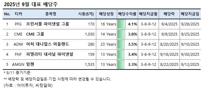 9월에 배당을 지급하는 대표 배당주로는 프린서플 파이낸셜 그룹(PFG), CME 그룹(CME), 아처 대니얼스 미들랜드(ADM), 피델리티 내셔널 파이낸셜(FNF), 암젠(AMGN) 등 5개 종목이 선정되었습니다.