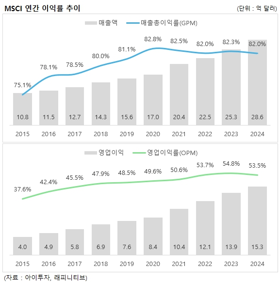 MSCI는 안정적인 비즈니스를 기반으로 높은 수익성을 이어가고 있습니다. 매출은 12년 연속 증가했으며, 매출총이익률과 영업이익률 또한 매우 높은 수준을 꾸준히 유지하고 있습니다.