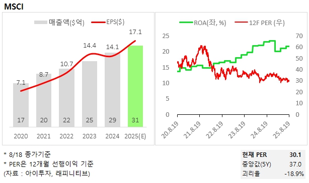 MSCI는 금융시장의 구조적 변화 속에서 장기적인 성장 모멘텀을 보유하고 있습니다. 특히 패시브 투자(ETF, 인덱스펀드)로의 자금 유입이 지속되면서 인덱스 라이선스 수익이 꾸준히 증가할 것으로 기대되고 있습니다.