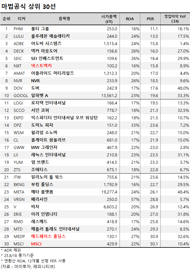 8월 마법공식 상위 30선에는 넥스트랙커, 메드페이스, MSCI가 새롭게 포함되었고, 칼라일, 킴벌리클라크, 애보트는 목록에서 제외되었습니다.