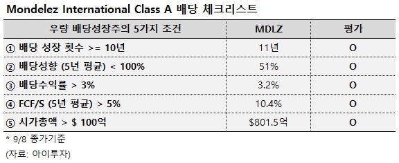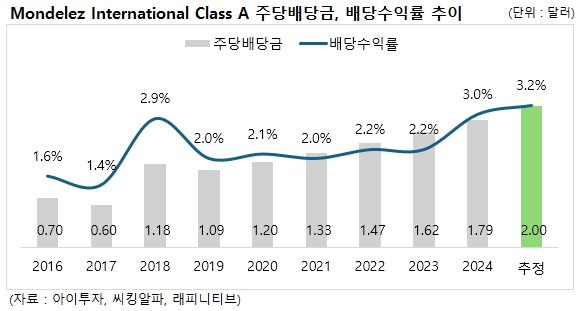 몬델리즈 인터내셔널은 11년 연속 배당금을 인상해온 배당성취주(10년 이상 연속 인상)로, 9월 8일 종가 기준 기대 배당수익률은 3.2%입니다(기대 연간 주당 배당금 2달러 기준). 배당락일은 9월 30일, 배당 지급일은 10월 14일로 예정되어 있으며, 최근 5년간 주당 배당금은 연평균 10.4%의 높은 증가율을 기록하고 있습니다.