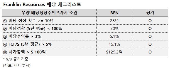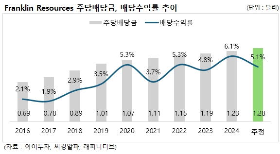 프랭클린 리소시스는 28년 연속 배당금을 늘려온 배당귀족주(25년 이상 연속 인상)로, 9월 1일 종가 기준 기대 배당수익률은 5.1%입니다(기대 연간 주당 배당금 1.28달러 기준). 배당락일은 9월 30일, 배당 지급일은 10월 10일로 예정되어 있으며, 최근 5년간 주당 배당금은 연평균 4%씩 증가해왔습니다.