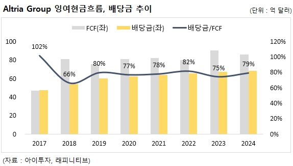 알트리아 그룹의 최근 5년간 평균 배당성향(순이익 대비 배당금 비율)은 132%로 100%를 웃돌았지만, 최근 3년간 순이익이 꾸준히 증가하면서 상황이 개선되고 있습니다. 순이익은 2022년 57.6억 달러에서 2023년 81.3억 달러, 2024년에는 112.6억 달러로 지속적인 성장세를 보였고, 이에 따라 배당성향도 지난해에는 60.8%로 크게 낮아졌습니다. 또한 실질적인 배당 재원인 잉여현금흐름 대비 배당금 비율은 최근 5년 평균 78%로, 안정적인 배당 여력을 충분히 유지하고 있습니다.
