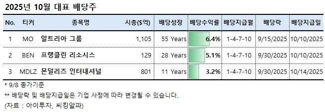 10월에 배당을 지급하는 대표 배당주로는 알트리아 그룹(MO), 프랭클린 리소시스(BEN), 몬덜리즈 인터내셔널(MDLZ) 등 3개 종목이 선정되었습니다.