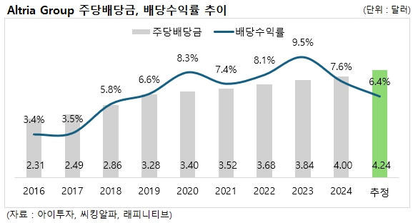 특히 지난 '23년에는 주가가 비교적 낮은 구간에 머물러 있었음에도 불구하고 배당금을 지속적으로 인상하며, 연말 기준으로는 9.5%의 높은 배당수익률을 기록하기도 했습니다. 이 시점에 알트리아 그룹을 매수했다면, 연간 약 10%에 달하는 배당수익률을 장기적으로 확보할 수 있었을 것입니다.