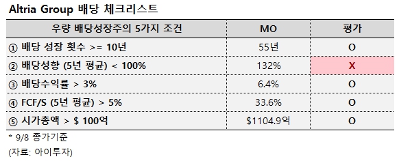 알트리아 그룹은 55년 연속 배당금을 늘려온 '배당킹(50년 이상 연속 인상 기업)'으로, 9월 8일 종가 기준 기대 배당수익률은 6.4%입니다(기대 연간 주당 배당금 4.24달러 기준). 배당락일은 9월 15일, 배당 지급일은 10월 10일로 예정되어 있습니다. 최근 5년간 주당 배당금은 연평균 4%씩 꾸준히 증가해왔습니다.