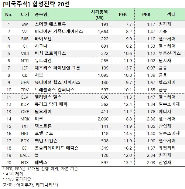 11월 3일 종가 기준 합성전략 상위 20개 기업으로는 스머핏 웨스트록(SW), 버라이존 커뮤니케이션스(VZ), 바이오젠(BIIB), 시그나(CI), 비치 프로퍼티스(VICI), 뉴트리엔(NTR), 제프리스 파이낸셜 그룹(JEF), 처브(CB), 유니버셜 헬스 서비시스(UHS), 트래블러스 컴퍼니스(TRV), 엘리밴스 헬스(ELV), 큐리그 닥터 페퍼(KDP), 원오케이(OKE), 머크(MRK), 텍스트론(TXT), 호멜 푸드(HRL), 벡턴 디킨슨(BDX), 콘솔리데이티드 에디슨(ED), 볼(BALL), 페덱스(FDX) 등이 포함되었습니다.