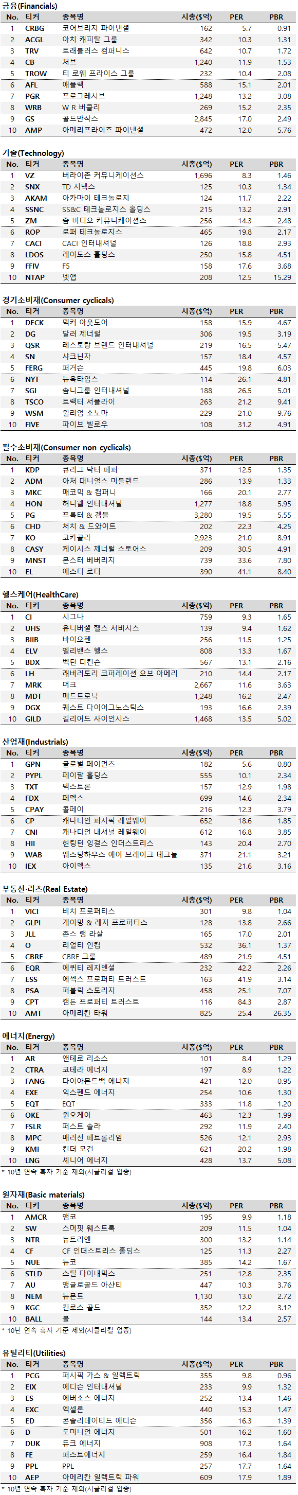 여기에 시가총액 100억 달러 이상, 최근 분기 트리플 증가(매출액·영업이익·순이익 모두 전년 동기 대비 증가), 10년 연속 흑자(결산기간 10년 미만시 흑자율 100%) 등 펀더멘털 기준을 추가해 최종 선별했습니다.