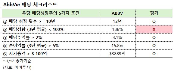 애브비(ABBV)는 12년 연속으로 배당금을 인상한 배당성취주(10년 이상 인상)입니다. 12일 종가 기준 기대 배당수익률은 3.1%(세후 2.7%)이며, 배당락일은 1월 16일, 배당 지급일은 2월 17일로 예정되어 있습니다.