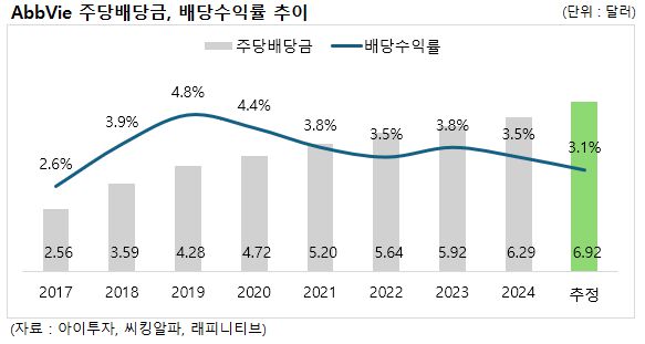 애브비의 배당수익률은 최근 10년간 대체로 3%~4% 구간에 형성되었으며, 매해 꾸준한 주가 상승을 동반하면서 현재는 배당수익률이 3% 초반으로 낮아졌습니다.