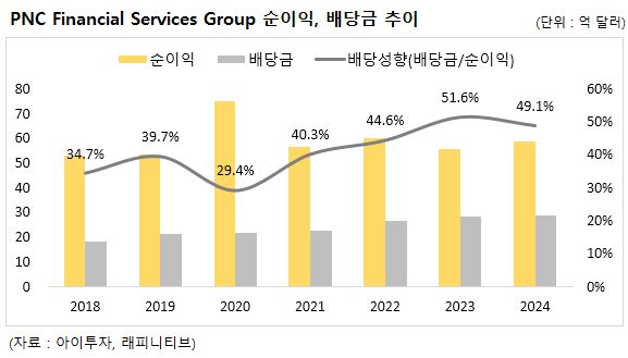 PNC는 매해 대표 배당성장주로 분류될 만큼 안정적인 배당지표를 유지하고 있습니다. 최근 3년 평균 배당성향은 약 48%로 배당 여력이 충분한 편이며, 순이익률도 26%로 높게 유지되고 있습니다. 시가총액은 약 846억 달러에 이르러 규모 면에서도 탄탄해, 배당주 포트폴리오의 기초를 다지는 데 적합한 종목이라 할 수 있습니다.