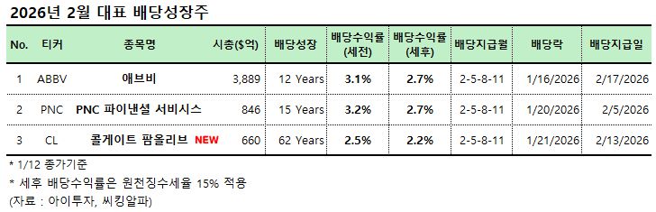 2026년 2월에 배당을 지급하는 대표 배당성장주로는 애브비(ABBV), PNC 파이낸셜 서비시스(PNC), 콜게이트 팜올리브(CL) 등 3개 종목이 선정되었습니다.