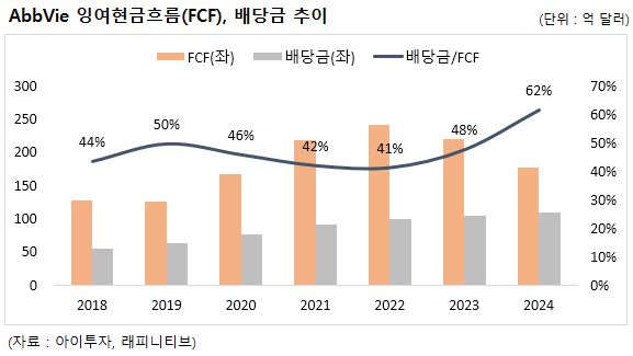 애브비는 지난 '23년 주요제품인 '휴미라(Humira)' 특허 만료 이후 인수합병 중심의 성장 전략을 취하고 있습니다. 이 과정에서 무형자산 상각비나 일회성 비현금 비용이 발생해 이익이 낮게 형성되지만, 회계적 비용(실제 현금 유출이 없는)을 제외한 현금흐름은 양호합니다.