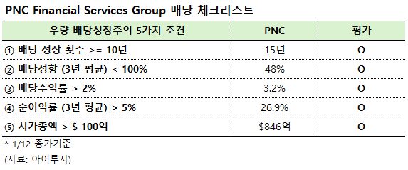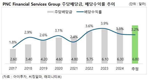 PNC 파이낸셜 서비시스(이하 PNC)는 15년 연속으로 배당금을 인상한 배당성취주(10년 이상 인상)로 12일 종가 기준 기대 배당수익률은 3.2%(세후 2.7%)입니다. 배당락일은 1월 20일, 배당 지급일은 2월 5일로 예정되어 있습니다.