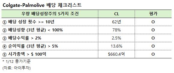 콜게이트 팜올리브(이하 CL)는 무려 62년 연속으로 배당금을 인상한 배당킹(50년 이상 인상)입니다. 12일 종가 기준 기대 배당수익률은 2.5%(세후 2.2%)며 배당락일은 1월 21일, 배당 지급일은 2월 13일로 예정되어 있습니다.
