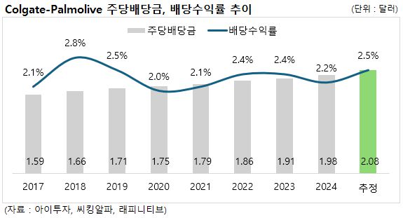 CL은 오랜 배당 역사를 자랑하지만, 기업이 성숙기에 접어들면서 배당 성장 속도는 다소 완만한 편입니다. 최근 10년간 연평균 배당 성장률은 3.3%, 최근 5년은 3.5%로 비교적 낮은 수준이며, 같은 기간 배당수익률은 2%에서 2.5% 수준을 유지해왔습니다. 변동성이 낮은 채권형 배당주를 찾는다면 적절한 선택이 될 수 있습니다.
