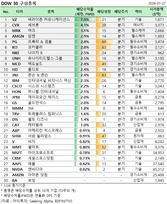 26일 종가기준 다우의 개 10선은 다음과 같습니다. 최근 미국 증시 강세로 인해 배당수익률은 전통적 수준보다 낮은 편입니다.
