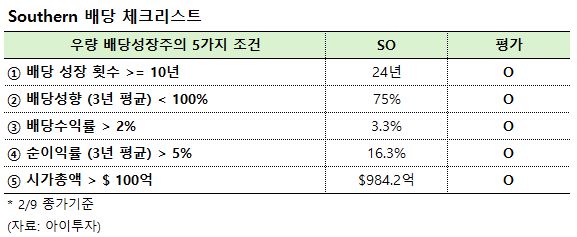 서던(SO) 24년 연속으로 배당금을 인상한 배당성취주(10년 이상)입니다. 9일 종가 기준 기대 배당수익률은 3.3%(세후 2.8%)며, 배당락일은 2월 17일, 배당 지급일은 3월 6일로 예정되어 있습니다.