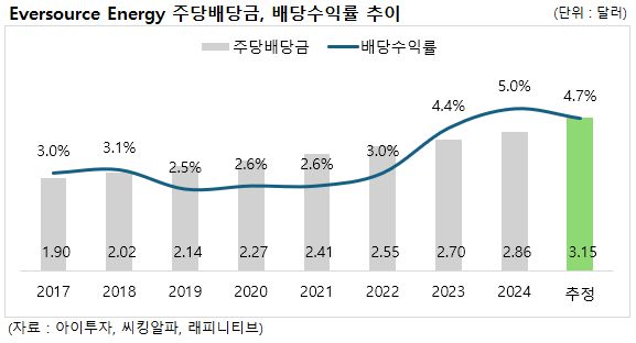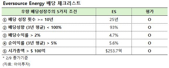 에버소스 에너지(ES)는 25년 연속으로 배당금을 인상한 배당귀족주(25년 이상)입니다. 9일 종가 기준 기대 배당수익률은 4.7%(세후 4.0%)며, 배당락일은 3월 5일, 배당 지급일은 3월 31일로 예정되어 있습니다.