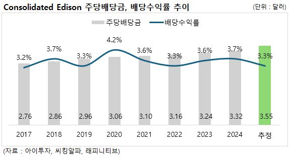ED는 최근 10년간 약 3% 수준의 배당수익률을 유지해 왔으며, 최근 5년간 주당 배당금은 연평균 3% 증가했습니다. 같은 기간 주가는 연평균 8% 상승해, 서던과 마찬가지로 배당 성장률보다 주가 상승 속도가 더 빠른 흐름을 나타냈습니다.