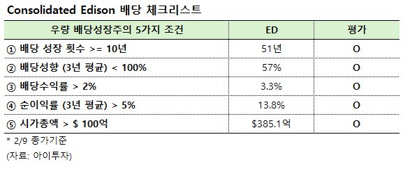 콘솔리데이티드 에디슨(이하 ED)은 무려 51년 연속으로 배당금을 인상한 배당킹(50년 이상)입니다. 9일 종가 기준 기대 배당수익률은 3.3%(세후 2.8%)며, 배당락일은 2월 18일, 배당 지급일은 3월 16일로 예정되어 있습니다.