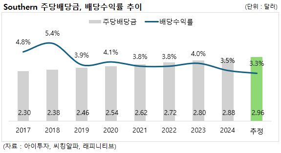 서던의 배당수익률은 지난 10년 동안 대체로 3%에서 4% 사이에서 형성되어 왔으며, 현재는 이 범위 내에서도 낮은 수준에 머물고 있습니다. 주당 배당금은 최근 5년간 연평균 3.1% 늘어났지만, 같은 기간 주가는 연평균 7% 상승하면서 분모인 주가가 더 커지며 기대 배당수익률은 낮아졌습니다.