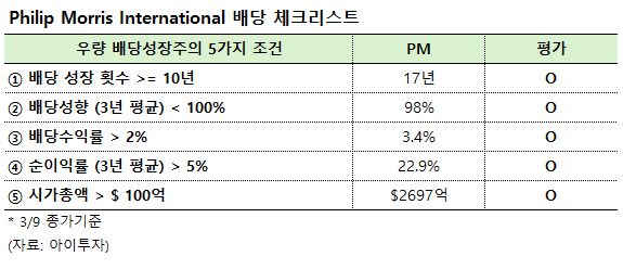 필립 모리스 인터내셔널(PM)은 17년 연속으로 배당금을 인상한 배당성취주(10년 이상)입니다. 9일 종가 기준 기대 배당수익률은 3.4%(세후 2.9%)며, 배당락일은 3월 19일, 배당 지급일은 4월 13일로 예정되어 있습니다.