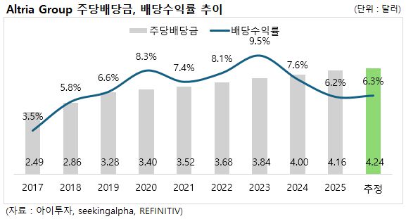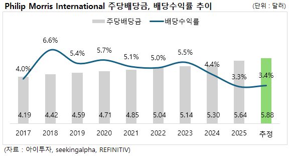 2023년까지 5%대를 유지하던 배당수익률은 2024년부터 다소 낮아졌습니다. 주력 비연소 제품인 아이코스(IQOS)의 글로벌 점유율 확대와 미국 내 니코틴 파우치 브랜드 ZYN(진)의 폭발적인 성장에 힘입어 실적이 크게 개선되었고, 이에 따라 주가가 크게 상승했기 때문입니다.