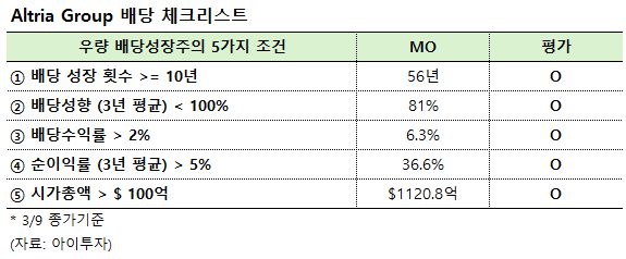 알트리아 그룹(MO)는 56년 연속으로 배당금을 인상한 배당킹입니다. 9일 종가 기준 기대 배당수익률은 6.3%(세후 5.4%)며, 배당락일은 3월 25일, 배당 지급일은 4월 30일로 예정되어 있습니다.