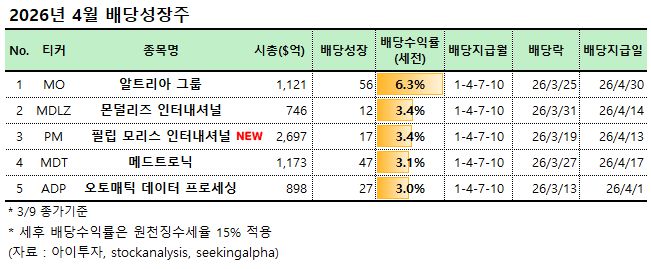 다음달인 4월에 배당을 지급하는 대표 배당성장주로는 알트리아 그룹(MO), 몬덜리즈 인터내셔널(MDLZ), 필립 모리스 인터내셔널(PM), 메드트로닉(MDT), 오토매틱 데이터 프로세싱(ADP) 등 5개 종목이 선정되었습니다.