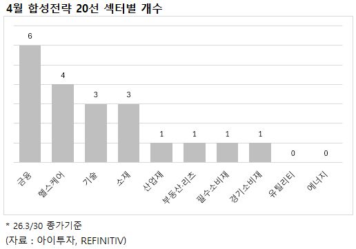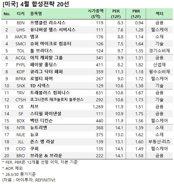 3월 30일 종가 기준 합성전략 상위 20개 기업으로는 프랭클린 리소시스(BEN), 유니버셜 헬스 서비시스(UHS), 앰코(AMCR), 슈퍼 마이크로 컴퓨터(SMCI), 톨 브라더스(TOL), 아치 캐피탈 그룹(ACGL), 페이팔 홀딩스(PYPL), 큐리그 닥터 페퍼(KDP), 로열티 파머(RPRX), TD 시넥스(SNX), 트래블러스 컴퍼니스(TRV), 코그니전트 테크놀로지 솔루션스(CTSH), 처브(CB), 스티펄 파이낸셜(SF), 벡턴 디킨슨(BDX), 뉴트리엔(NTR), 뉴코(NUE), 존스 랭 라살(JLL), 쿠퍼(COO), 브라운 & 브라운(BRO) 등이 포함되었습니다.